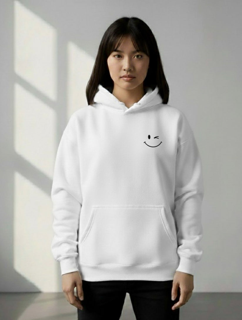 A clean white hoodie with a small, cheerful winking smiley face design positioned on the chest. It's a subtle, fun, and optimistic design for everyday wear.