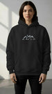A stylish black hoodie featuring a simple, thin-line outline of three mountains under a small moon and stars. This design has a serene, nature-inspired, and minimalist